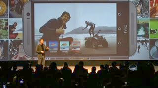 HTC's Jonah Becker shows off the company's new photo and video features at a press event in New York City. The new camera sports two lenses on the back to help users create more 3D-like images, while the video camera lets users edit their videos inside the camera.